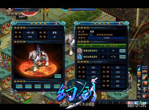 在《幻剑》中,玩家可以通过任务升级获得武侠生中的第一匹坐骑,如果玩家钟情马儿走江湖,就可以利用马儿养成系统来升级马儿的品阶,属性等,让马儿一直陪伴你闯奇幻江湖,当然如果玩家希望自己能有更多坐骑,可以购买成品坐骑,但是品阶属性还是需要依靠玩家来培养的哦!坐骑的快慢,属性成长都依靠玩家,坐骑的提升也直接影响到玩家的战斗能力,你是不是伯乐,就看你的坐骑是不是千里马啦!