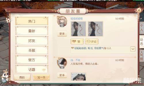 左滑右滑选好对象后,在朋友圈互动加深了解。玩家满足一定等级可解锁朋友圈功能,分享心情、秀出真我、曝光猛料,把你最好的一面展示出来,让江湖同道们更加了解你。朋友圈默认所有人可见,点赞多的还能冲上热榜。也可以将各种小秘密,设置为只有专属的Ta可见,为你营造浪漫的私密空间。
