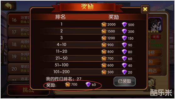 通过竞技场的每日排名可以领取到不菲的钻石,当然排名名次越高获得的钻石也就越多。第一名最高可以获得500钻石哦,心动了吗?那就快去挑战竞技场吧。