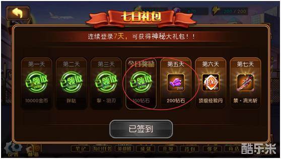 通过七日礼包的每日签到,在第四天和第五天就可以分别获得100、200的钻石奖励。