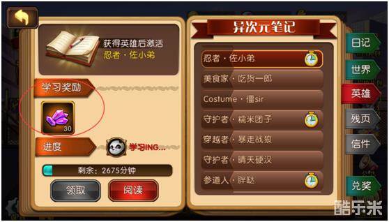 阅读异次元笔记中的英雄章节,可以获得不菲的学习奖励哟。