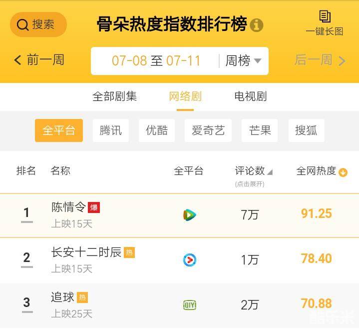《陈情令》比起《长安十二时辰》,无论从服化道、演员演技还是口碑来说,都是稍逊一筹的,但它却是热度最大的。这几天的骨朵热度指数排行榜7月8日到7月11日的日榜,还有一周的周榜,全平台中《陈情令》热度稳居第一,还出现了“爆”的字眼,在7月11日、7月12日剧集没有更新的日子里,它的讨论度还是十分高。