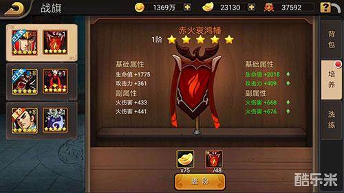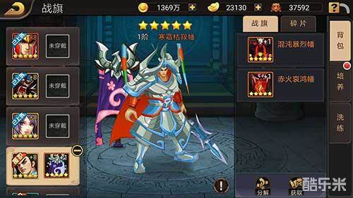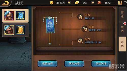游戏主界面养成里面的新成员战旗,大家一定不会陌生。点进去之后,视图的左侧是玩家们武将战旗穿戴情况中间是选中武将,如果拥有战旗则会插在武将身旁。由于每名武将都能带一面战旗,因此战旗的作用也是仅对单个武将有效。右侧横列是显示中拥有的战旗及碎片数量,纵列是培养和洗练。