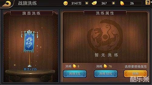 洗练属性有三个分别是2阶解锁的旗首属性,3阶解锁的旗面属性和4阶解锁的旗魂属性。洗练需要消耗洗练石,官方提供了单次洗练和10次洗练,10次洗练消耗的洗练石可以打95折,类似于探宝系统。这里小编建议大家还是有单次洗练吧,除了折扣太少之外,还有洗练出你需要的属性很可能就在下一次而不是在10次的最后一次。洗练出的属性根据强弱也有颜色之分,但不会超过战旗本身的颜色,也就是说紫色战旗最多洗练出紫色的属性,而不会出现橙色属性。