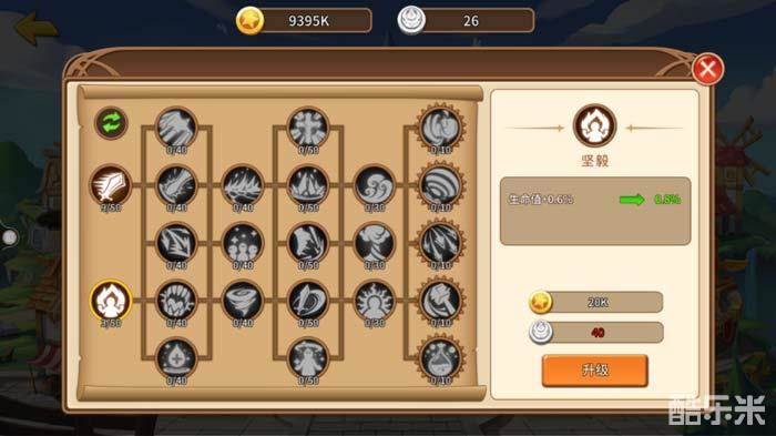 在科技树里,玩家可以选择基础的属性来升级,攻击、暴击、生命、格挡、防御等都可以提升,为全体英雄增加基础属性;还可以根据自己想要重点培养的英雄,选择不同的职业进行升级,例如增加战士生命值、增加法师攻击、增加刺客速度等,有针对性的提升你的战力!