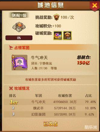 弱军团:在大部分成员战斗力都比较低的情况下,建议第一天早上全部人都不要打,买满次数,等到晚上11点半后,再统一打一座没人打过的1级城,因为1级城比较多,第一天也许会有几个1级城打不完的。这样等到12点刷新后,又有次数可以攻打,就是说集合两天的攻打次数,去攻打一座城。