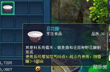 技能等级30—34级,消耗30点精力,可产出百花酿