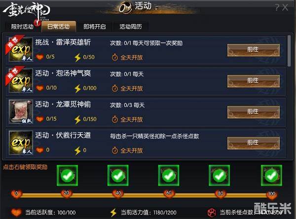 除了上述日常任务外,如果你还热衷于“刷刷刷”,《蛮荒搜神记》也同样可以满足你的需求!当玩家打开日常活动界面时,可以看到右下角有一个杀怪点数,该点数最多累计至1500点,并且会定时恢复。