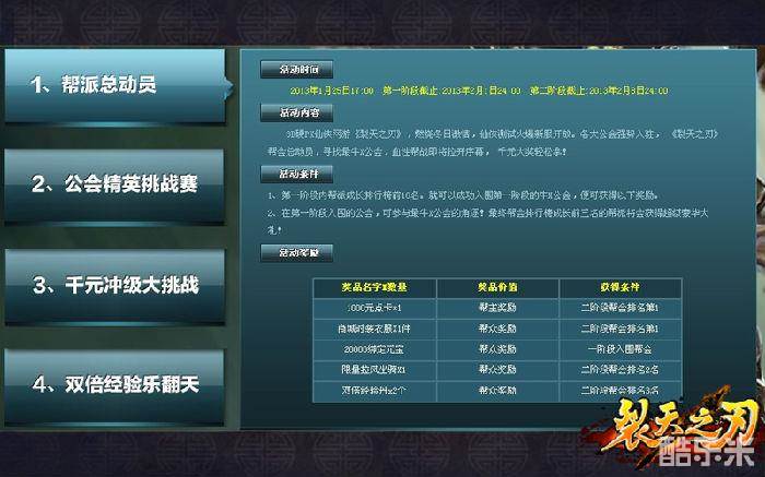 3D硬PK仙侠网游《裂天之刃》,燃烧冬日激情,火爆新服“花溪镇”、“落刃湾”强势开放。各大公会强势入驻,吹响2013年帮会争霸的号角,谁将问鼎九州,成就仙侠第一大帮;笑傲苍穹,与兄弟们一起书写自己的史诗!《裂天之刃》帮会总动员,寻找最牛X公会;血性帮战即将拉开序幕,丰厚奖励等你来拿!