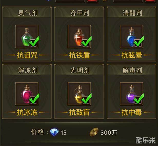 (ps:购买前三种药水,每种单价是100万金币,第四种开始每种售价5钻。全部买满需要300万+15钻)