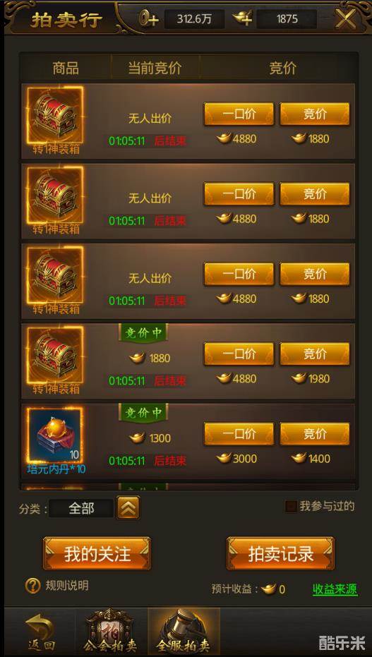公会拍卖:所有东西都是默认在公会里面拍卖,如果流拍之后就流到世界排名行中。当玩家直接购买一口价则可以直接买下。拍卖持续两小时,若有人竞拍,则按照最高的竞拍价成交。