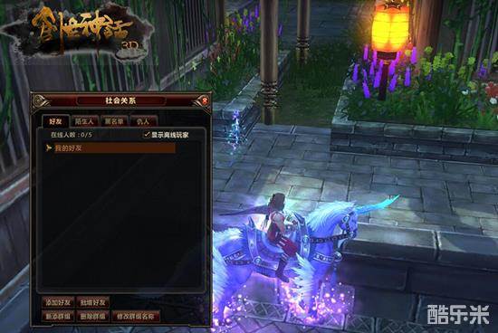 在好友界面中,玩家可查看好友的在线情况、等级和所在位置,同时还可以快捷地进行组队、发送邮件、发送书信等操作。玩家可编辑好友列表的分组,以方便查找与管理,玩过企鹅的人都懂的。在好友界面中,除了好友分页外,还有陌生人、黑名单和仇人分页。