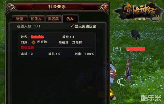 仇人相见分外眼红,猝不及防的情况下被击杀的屈辱怎么能忘!系统会帮我记住并将它列入仇人列表中,仇人每次上线,自己会收到系统提示;仇人在聊天频道发言,系统将在其名字后方标注“仇人”。我要让他一辈子都带着这个标签过生活,并且伺机报仇!如有不爽,请勿跨省投诉,家无水表,快递请邮隔壁老王。