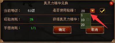 6.如下图,在消耗1本真灵力精华兑换手册的情况下,勾选使用20个真灵力精华加速秘籍,可一次性获得21个真灵力精华,且经验消耗不会增加。因为经脉修炼需要消耗大量的真灵力精华,因此使用加速秘籍可以更快速的提升经脉修炼的进度。