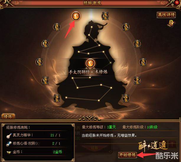 2.鼠标点击选中第1条经脉图标手太阴肺经,点击下方的开始修炼按钮,即可进行经脉修炼,每次修炼需要消耗1个真灵力精华、1个修炼心得(初阶),以及2金,修炼1次提升1个阶段。