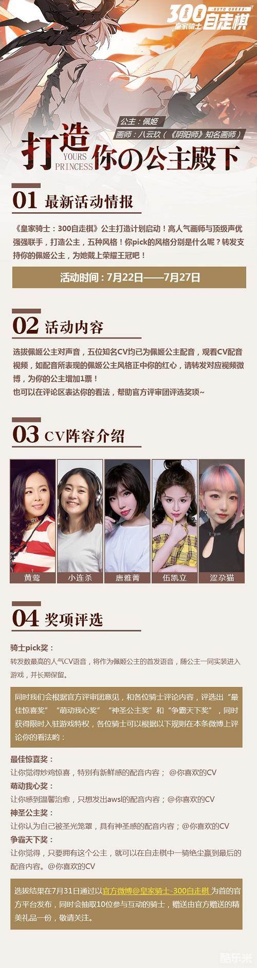 2019年7月22日至27日,《皇家骑士:300自走棋》公主殿下打造计划就此启动!佩姬殿下拥有人气知名画师八云玖亲自设计的完美人设,而她的美妙声音,则完全交给各位骑士大人们决定!请大家踊跃参与!