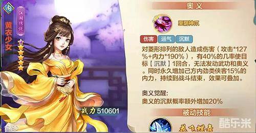 黄衣少女,在橙色三练武后,可以选一个被动技能使用,分别是花飞蝶舞和戮力同心,此2个被动,效果都比较类似,都是免伤类型效果,大侠们完全可以根据自身队伍的实际情况来进行选择呢~
