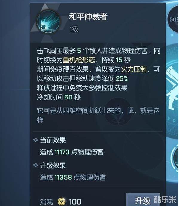 和平仲裁者:能击飞以自身为圆心的圆形范围内最多5名敌人,同时造成伤害,敌人被击飞后会倒地,无法做出其它动作。玩家有一定的时间在安全状态下追加攻击,同时普攻切换为一定时间的强火力加特林机枪。
