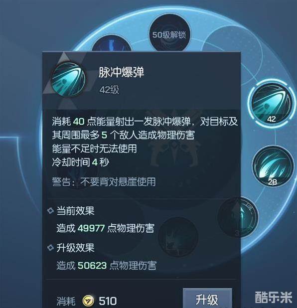 脉冲爆弹是一个消耗能量的AOE技能,在实战中建议将能量优先留给输出更高的粒子炮。在粒子炮无法使用或处于CD时,使用脉冲爆弹补充伤害。