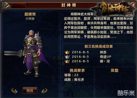 随着这些角色由弱到强,玩家的挑战之路也愈发艰难,不过相应的,完成挑战后的奖励也越来越丰富。战胜神将不仅可以领取丰厚的奖励如修行值、魂魄丹、武器精炼石,每个服务器前三名击败神将的玩家还将额外开启战胜奖励,赢取绝世珍兽、极品法宝东皇钟等诸多神器,并被记录在封神榜中供后来的玩家瞻仰!全服公告哟!简直比拿三好学生奖状还要鸡冻!