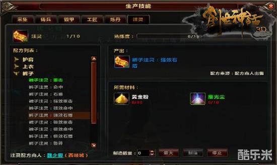 制造技能分为铸兵、锻甲、工匠、炼丹、注灵五种,玩家习得这制造技能后,打开生产界面(默认快捷键K)后,可查看自己的制造技能及等级,当然要想制造武器得先有注灵所需配方,不然也是巧妇难为无米之炊啊~