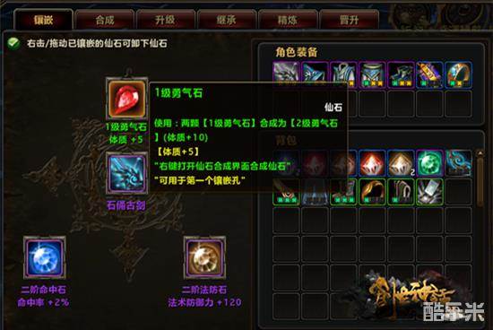 在游戏中不同的宝石有不同的属性,玩家要想好自己需要什么属性的宝石然后再砸石头哦~装备上一共有三个宝石镶嵌孔,有些装备是三个都开启了,有些是需要玩家自己用打孔工具——铁钻、金刚钻、七星钻——来开启。不同属性的石头能安装的部位是不同的,一个镶嵌孔往往能安装多种不同属性的石头,玩家镶嵌之前要考虑到自己装备的镶嵌孔是不是被其他属性的石头占了哦~