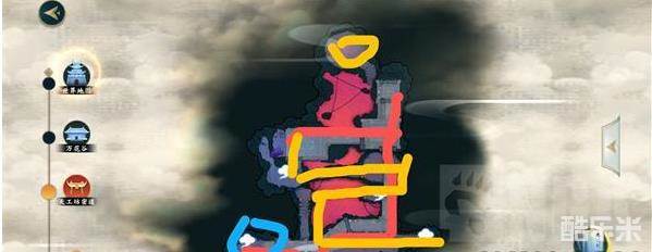 红色路线是朱军师的紫色材料孔明灯,后半段的黄色路线是弟子和李局的蓝色材料玄铁。这里提一句玄铁的需求量还是挺大的毕竟供应俩人,此图玄铁刷新数量为3或4,所以如果一次走完发现只有2个玄铁,下次来的时候请跳锁链去地图最上方,那里肯定有一块玄铁;如果一趟跑完有3个,那就见好就收吧。