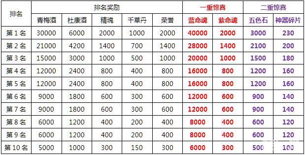 2. 活动期间累计充值金币达到10000金币,可以额外领取一重惊喜奖励(蓝命魂,紫命魂);
