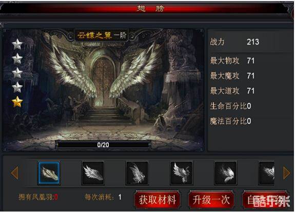 目前翅膀共有10阶,每阶翅膀等级分四星,共四个小等级,消耗“凤凰羽”能够增加经验条经验。每次升星和进阶均可获得大量属性。