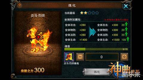 除了普通坐骑和vip坐骑外,每只坐骑都有星级,分为1星、2星、3星、4星、5星。玩家点击坐骑星级旁边的【箭头】可进入坐骑升星界面。每只坐骑升星需要【炼化】一定量这只坐骑独有的兽魂。炼化足够的兽魂后坐骑自动升星。升星后坐骑的属性将有极高提升。