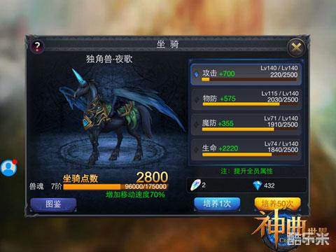 玩家等级升至38级时开放坐骑系统,会在指引新的功能【坐骑】,点击打开坐骑界面。玩家获得坐骑后需要通过培养,增加坐骑的属性,并增加坐骑经验。坐骑经验累积能提高坐骑的阶级。坐骑阶级越高,能培养的属性等级上限越高。坐骑培养分为【培养1次】,【培养50次】:其中培养1次:需要消耗1个“兽灵石”或一定的钻石,会对当前坐骑进行一定的属性提升,更为惊喜的是,与此同时,有一定的几率出现兽神祝福,此祝福效果可将本次提升的属性增加至几倍之多。