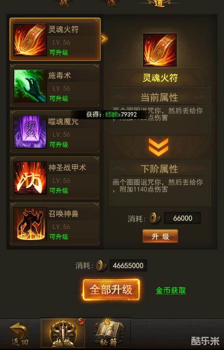 (2)消耗金币可以提升技能等级,提升技能等级可增加技能的伤害;