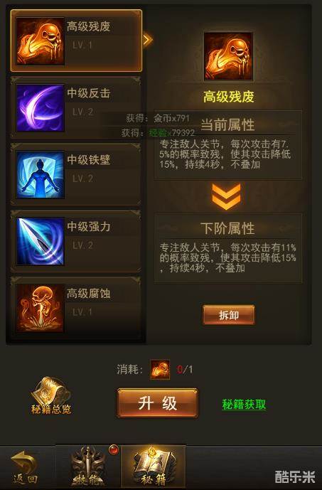秘籍升级:对角色已学习的秘籍,可以消耗相同秘籍对其进行升级,级别越高,效果越强;