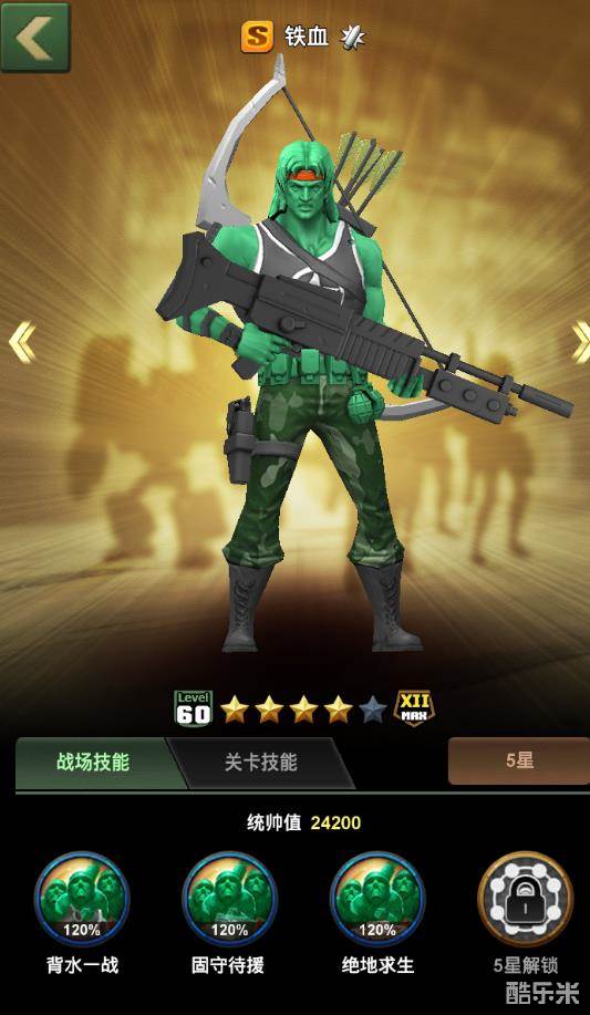 拥有超强的部队统治力,在铁血的带领下,直接提高部队攻击、防御和生命3%,并且在战斗时随着这战斗回合的不断提升还将继续三项属性。难怪在以一敌百时依然能杀出重围