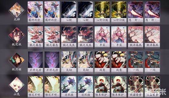 桃花妖:作为一个辅助为二核心提供护航,在犬神或妖刀姬生命值不健康的情况下,能有提供有效保护,还能使用“丰实”加速核心式神的成长。