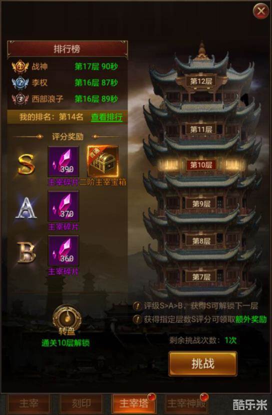 玩家每天有两次挑战主宰塔的机会,奖励会因通关评分高低而有所不同,评分只和通关速度挂钩。评分达到S时奖励最为丰厚,除了常规奖励的主宰碎片,在某些层数还可能会有主宰宝箱的奖励哦!而且,只有达到S评分,玩家才能攀登到更高一层,挑战更强大的守关BOSS。