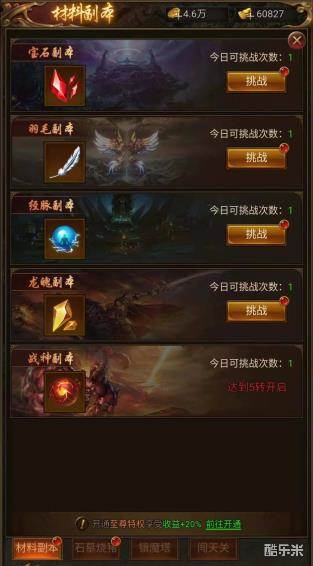 每日挑战副本后,还还可以花500元宝扫荡获得材料哦。如果开通至尊卡之后,可以更方便的扫荡,材料副本收益还可提升20%。