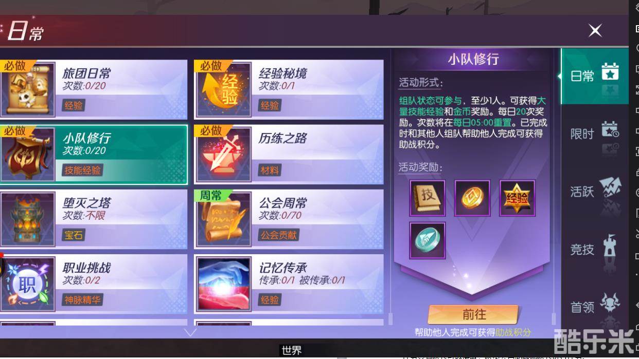 43级可以从日常界面开启小队修行。小队修行是组队进行的一系列副本任务,最少一人参加,需要队长带队。