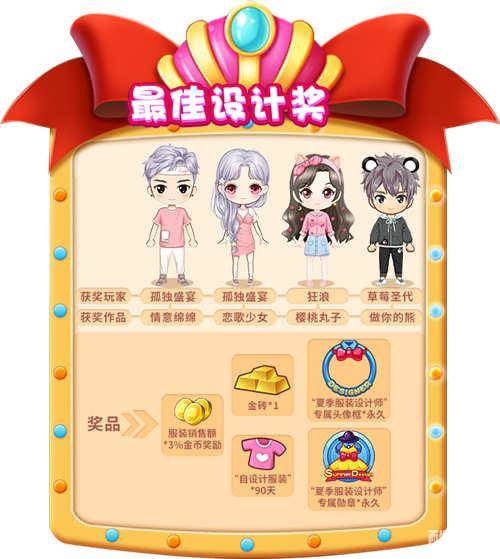 2.“自设计游戏服装”奖励将于作品正式上线游戏商城时发放,请获奖小伙伴耐心等待;