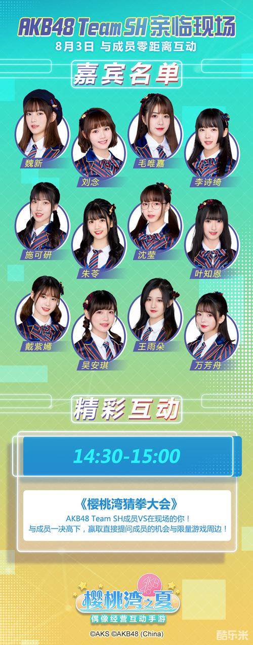 8月3日14:30-15:00,AKB48 Team SH将亲临ChinaJoy盛趣游戏展位,与现场粉丝见面。12位元气偶像将带来跨次元演出,更有《樱桃湾猜拳大会》互动游戏,面对面零距离接触偶像,机会难得,不容错过。