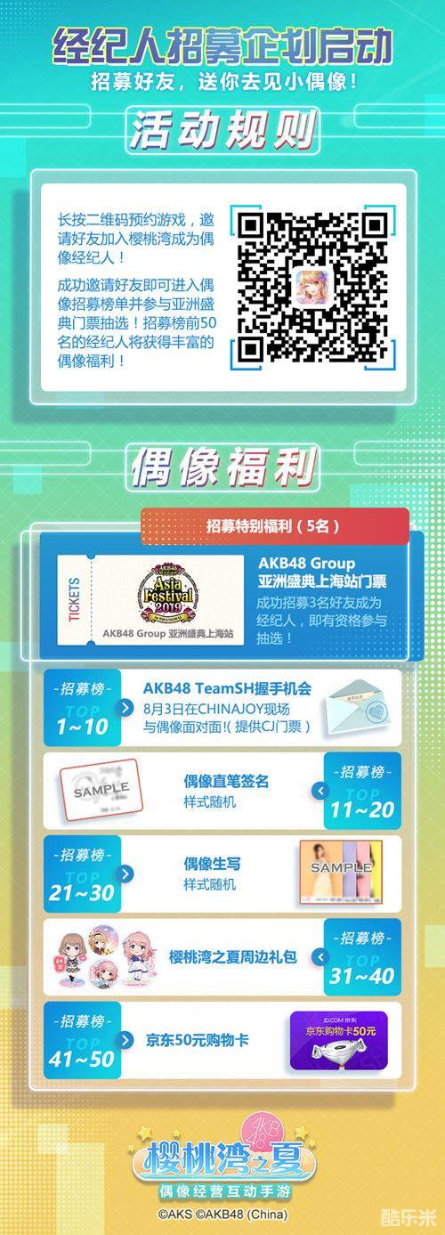 《AKB48樱桃湾之夏》先全面开启经纪人招募企划,如果你希望亲手打造自己的偶像天团,就快快加入樱桃湾经纪人队伍吧。只需预约游戏并成功邀请好友就能加入企划,并有机会获得AKB48 Group亚洲盛典上海站门票、偶像签名、偶像生写等丰厚奖励!