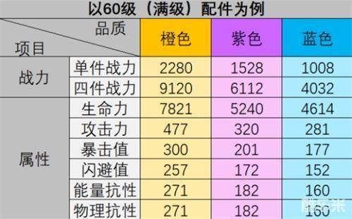 那么我们分别从配件的属性和套装效果讨论,首先是配件属性,我们知道每个配件都有不俗的属性,那么以全60级配件为例,其不同配件品质的属性和战力是什么情况呢?如下: