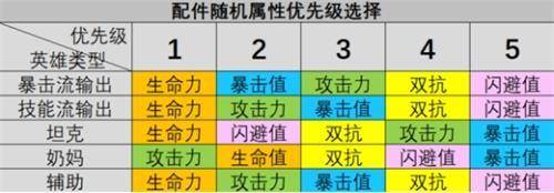 我们在合成配件、配件抽奖、挑战副本所获得的随机配件中,除了配件部位、套装外,还需要考虑配件的随机属性,这是因为随机属性占配件所有属性的1/2,而这个随机,也就是判断配件是否为极品或鸡肋的唯一标准,以下给出不同类英雄的配件属性优先级,供大家参考: