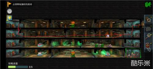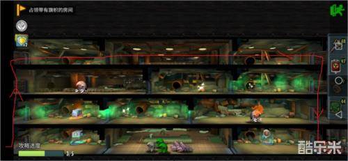 第2层 往右上电梯右走到头拿箱子,往左返回第2个电梯往左到头,下到底往右占旗子。战力不够的可以下中间电梯右走拿个BUFF。
