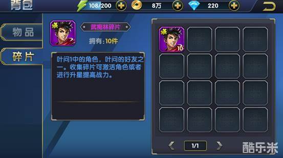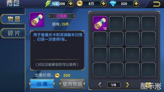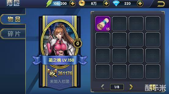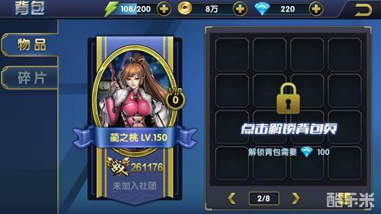 二、主界面的背包是存放游戏各种道具、礼包和主角与宗师碎片的背包,该背包只有物品标签页,有8页背包格。