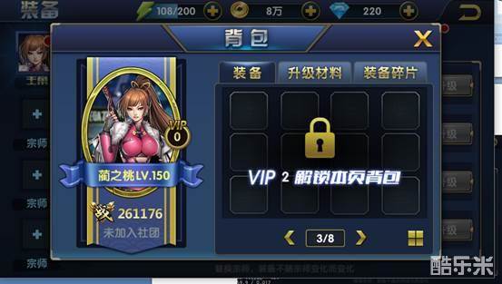 三、装备中的背包是用来存放玩家获得的装备、装备升级材料和装备碎片,在这3个标签页中它们都有8页背包格。它们也都是第1页是免费开放,但是后续7页背包格是根据玩家VIP等级开放的。