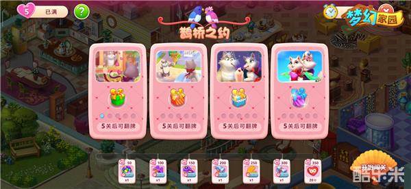 本次活动,家园为玩家准备了4张主题活动卡,完成主题卡上的任务后,即可获得对应丰厚礼包。每张七夕主题卡上都设置有5个关卡,玩家需要一次性闯过5个关卡才能激活该活动卡,赢取对应的进度礼包,解锁浪漫的七夕小剧场。如果中途不幸落败,那就需要从头再来哦。所以关键时刻一定不要心软,不妨使用道具让帮助自己顺利通关。