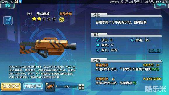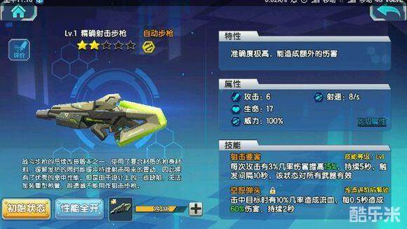这把枪拥有自动步枪拥有标准的载弹量(热耗8)和伤害(初始100%),但是却有两个强大的效果,第一个伤害增幅不用说,提高了一半时间的输出,而且可以在buff期间切狙击火箭筒之类的提高伤害。