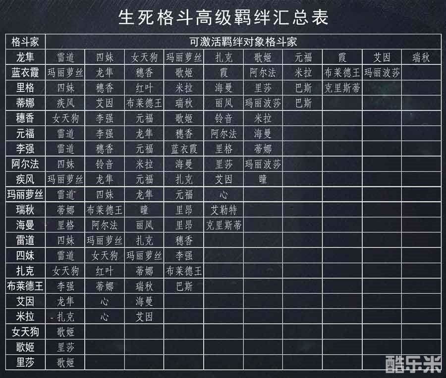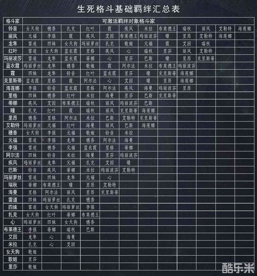 《生死格斗5无限》格斗家羁绊的分析与应用,在游戏中每位格斗家都有不同的羁绊,解锁羁绊可提升实力,下面就让我们一起来看看这些羁绊吧!