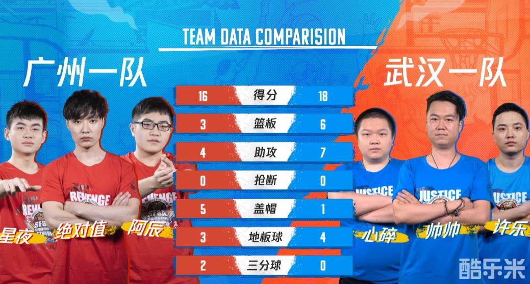 败者组比赛中,唯一的复仇阵营广州队面对帅帅领衔的武汉1队,败者将直接被淘汰,第一局阿辰SF最后时刻空位3分不进痛失扳平比分的机会,武汉1队先得1分。第二局实力强劲的广州队依靠稳健的防守扳回一分,第三局阿辰连续得分力保球队再拿一分,广州队获得赛点。随后帅帅战队顶住了压力,稳扎稳打将比赛拖入决胜局,关键时刻许可成功卡掉对面球并且绝杀扣篮,终结了复仇战队的最后的希望,绝对值所在的广州队屈居第4。